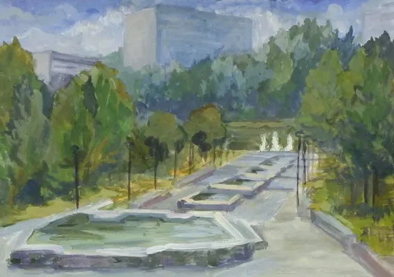 Живописная пленэрная работа выполнена в технике гуашь. На работе изображен каскад фонтанов — отличительная особенность фонтанов в парке Победы в городе Зеленоград