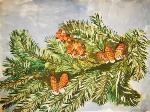 Ель, которая растет у нашего дома, особенно красивая зимой. Когда на всех деревьях опала листва, только она остается зеленой и пушистой. Иногда из парка прибегают даже белки.