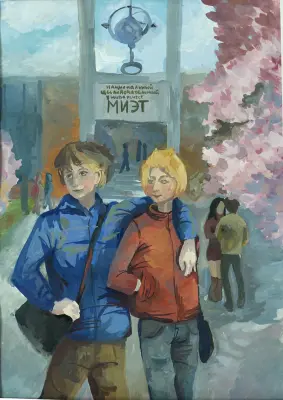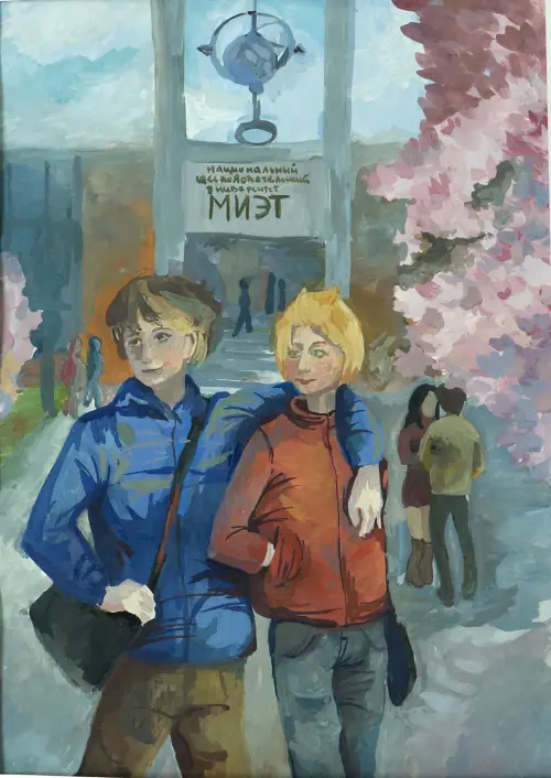 Работа выполнена в технике гуашь. На работе изображены жители города Зеленограда, студенты Московского института электронной техники, будущие инженеры.Работа выполнена в технике гуашь. На работе изображены жители города Зеленограда, студенты Московского института электронной техники, будущие инженеры.