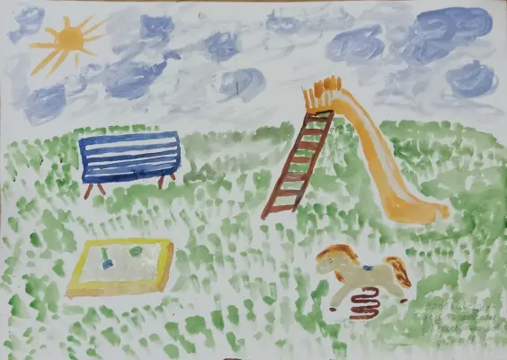 Люблю гулять на детской площадке. Кататься с горки, на качелях. Когда собирается много друзей, играем в прятки. Есть лавочка, можно посидеть и отдохнуть.