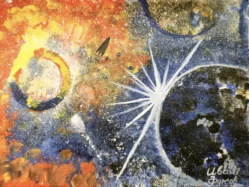Картина напоминает о том, что даже в шумном и оживленном мегаполисе можно найти красоту и умиротворение, погружаясь в бескрайний и таинственный мир звезд.На картине изображено ночное небо над Москвой, усеянное яркими звездами.