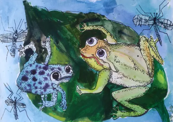 Бумага, акварель, маркер, 42×30.Вечером на пруду лягушка погналась за комаром. Но оказалось, что другая лягушка тоже погналась за ним. Лягушки начали спорить, чей это комар. А комары тем временем все разлетелись.