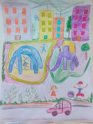 Здравствуйте. На моем рисунке изображен мой любимый район, где я люблю проводить свободное время с моими друзьями и сестренками. В нашем районе очень много площадок, чтобы нам интереснее было проводить время. Площадка нашего двора для нас самая интересная и лучшая.
