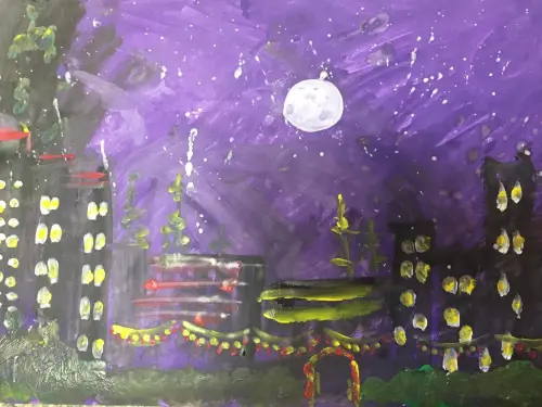 На моем рисунке изображен мой район поздним вечером. Мне нравится, когда наступает темнота, в домах зажигается свет и окна освещают улицы. Я очень люблю вместе с родителями гулять вечером.