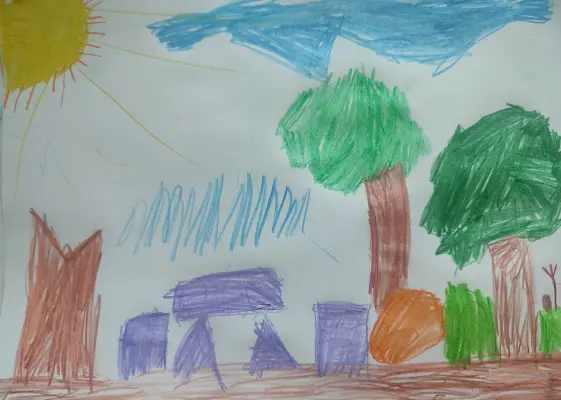 Таким я вижу место возле моего дома, где я люблю гулять, резвиться с друзьями. Люблю свой район – очень красивый, и я его нарисовал. У нас много площадок, которые хочется рисовать и рисовать!