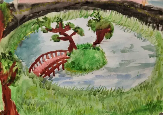 На моем рисунке изображен пруд, который находится в Лосином острове. Название у него Бабаевский. Это замечательное место для прогулки и зимой, и летом.