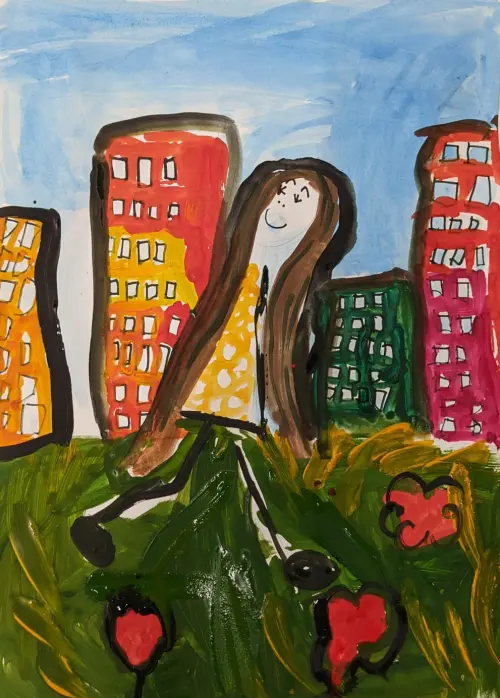 Я люблю свой район: он с высокими домами, яркими площадками и здесь много моих любимых друзей.
