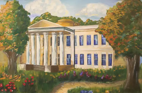 На моем рисунке изображена бывшая загородная усадьба Вяземских-Шереметьевых в селе Остафьево. Я очень часто посещаю этот красивейший уголок и люблю здесь рисовать.