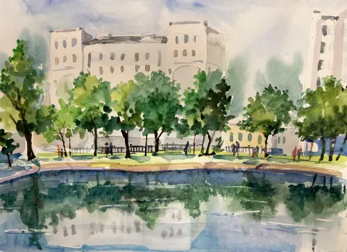 Я проживаю в районе Арбат, но очень люблю гулять по Чистым прудам. Мы часто встречаемся здесь с друзьями, ходим в кафе и гуляем вокруг прудов. Я не профессиональный художник, но постаралась передать в своей работе красоту этого места.