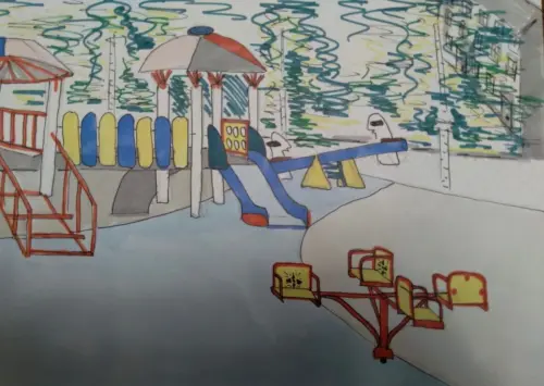 Это двор около дома. В нем всегда много ребятишек разного возраста. Я также провожу свободное время гуляя во дворе с подружками. Двор очень тихий и спокойный.