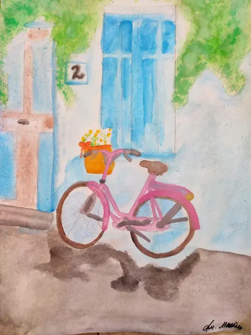 Я очень люблю рисовать. И мне очень нравится что в моём районе очень много парков. Я люблю гулять по паркам и мне нравится рассматривать красивые дома, замечать красивые объекты, а потом я прихожу домой и по памяти рисую то что мне больше всего понравилось и запомнилось. На этой картине я нарисовала велосипед с корзиной цветов который увидела у домика на ВДНХ. Мне понравилось что кругом было много зелени и цветов и даже в корзине были цветы. Мне кажется что летом прогулки в парке на велосипеде очень полезные и приятные. Можно медленно ехать и рассматривать разные дома и павильоны, фонтаны и клумбы с цветами. Эту работу я рисовала акварелью и немного добавила гуаши. В будущем я хочу стать настоящим художником. Я очень люблю рисовать. И мне очень нравится что в моём районе очень много парков. Я люблю гулять по паркам и мне нравится рассматривать красивые дома, замечать красивые объекты, а потом я прихожу домой и по памяти рисую то что мне больше всего понравилось и запомнилось. На этой картине я нарисовала велосипед с корзиной цветов который увидела у домика на ВДНХ. Мне понравилось что кругом было много зелени и цветов и даже в корзине были цветы. Мне кажется что летом прогулки в парке на велосипеде очень полезные и приятные. Можно медленно ехать и рассматривать разные дома и павильоны, фонтаны и клумбы с цветами. Эту работу я рисовала акварелью и немного добавила гуаши. В будущем я хочу стать настоящим художником.