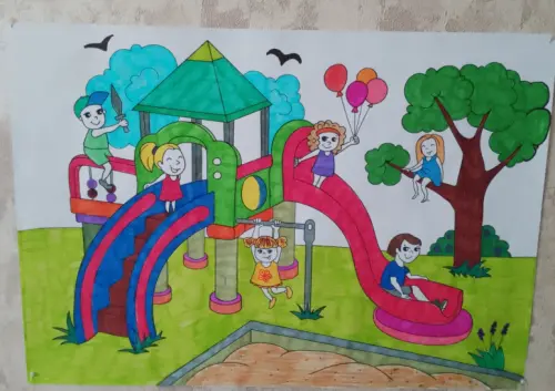 Такая площадка есть во дворе моего дома. На ней всегда очень много детей разного возраста. Такая площадка есть во дворе моего дома. На ней всегда очень много детей разного возраста. В этом году её покрасили в новые цвета, но жалко, что убрали качели.
