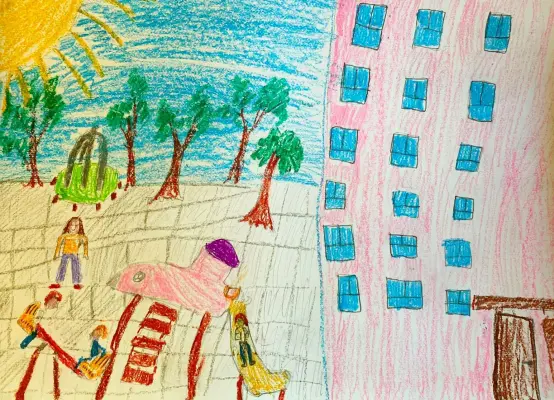 Нарисовал детскую площадку своего двора. Детская площадка совсем новая на фоне высоких домов. В этом жилом комплексе живу я со своей семьей, и мы с сестрой очень любим играть на ней после школы.
