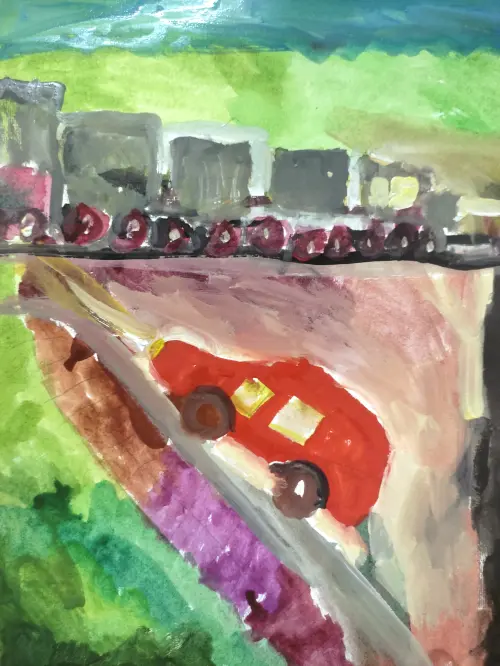 Коля в своей работе нарисовал красную машину, которая едет по дороге в горку, на дальнем плане виден товарный поезд. Работа получилась яркой и радостной.