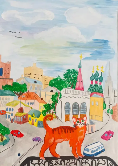 Работа называется «Живописный уголок на Полянке». Выполнена с помощью гуаши. На переднем плане изображен вид с балкона, где гуляет кот, далее храм Григория Неокесарийского.