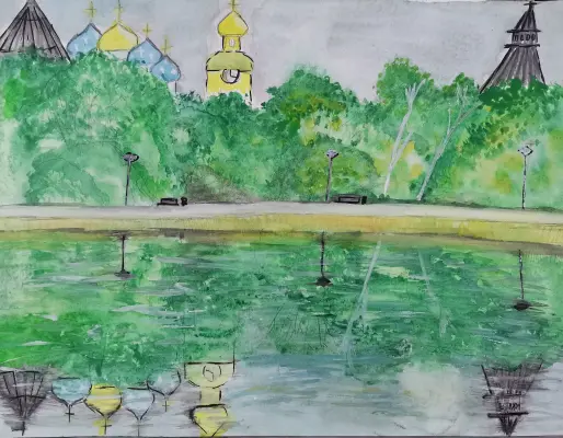 В начале июня мы гуляли всей семьёй вокруг монастыря, и нас там застал ливень. Как красиво было кругом! Я рисовала этот пруд по фотографии, хотя в памяти были именно эти краски.