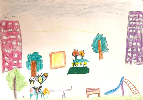 Нарисовала двор, дом, в котором живу, цветы, бабочки, лавочки. Мой любимый двор, где я играю. Я очень люблю рисовать! Мои рисунки я дарю воспитателям в детском саду и своим друзьям.