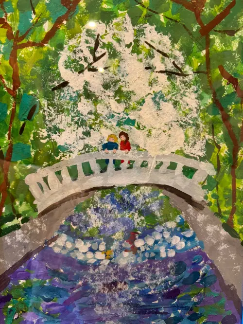 На картине мы стоим в Краснопресненском парке на мосту через канал. Эти мосты очень красивые и круглые! Парк — это одно из моих любимых мест, там всегда можно найти что-то интересное!