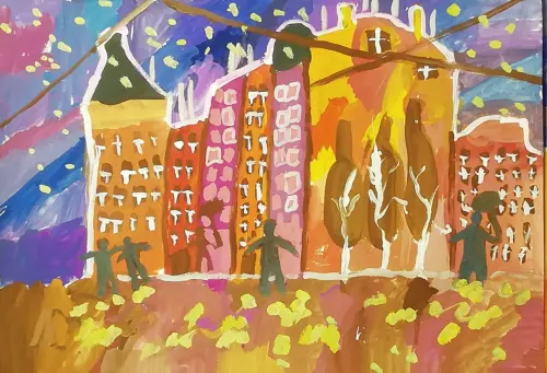 В каждом окне люди живут, отдыхают, пьют чай. С собакой гуляют. Приходят с работы. Делают уроки. И делают зарядку во дворе. А нас есть машина, она по домом, у неë новое зеркало, и еë охраняет Алиса.