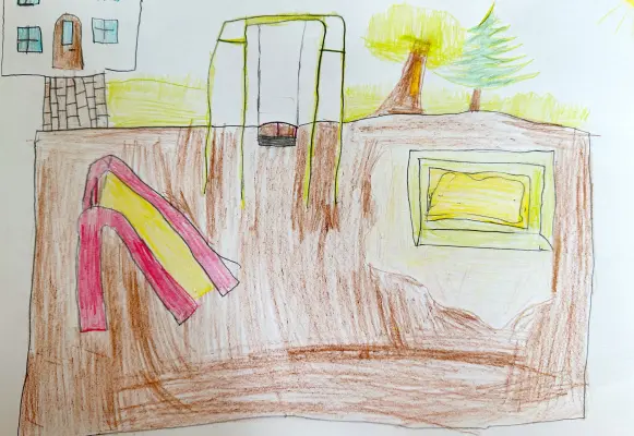На рисунке изображен мой двор в котором я очень часто гуляю! Люблю свой район, гуляем вечерами с сестрой мамой и папой, моя маленькая сестра очень любит качаться на качелях и кататься с горки во дворе