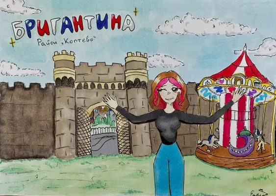 Бригантина-это парк, в котором я часто вижусь со своими друзями, гуляю и отдыхаю. На «московских сезонах» там часто проводят интересные мастер-классы и другие мероприятия. Еще там есть прекрасная карусель, которая днем просто красивая и красочная, а в вечернее время очень ярко светится и переливается разноцветными огнями лампочек. Также там есть кафе, в котором зимой можно купить теплое какао и согреться, а летом охладиться лимонадом или любым другим напитком. На рисунке мне изобразить бригантину не в точном виде, а немного изменить ее. Хотелось показать и замечательный замок и карусель во всей красе. На рисунке кстати есть я :), так что это еще и автопортрет!