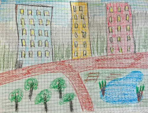 На рисунке мой Можайский район. Парк, возле которого я живу. Пруд, в котором плавают красивые утки. И я нарисовал дома, которые стоят рядом с моим домом.
