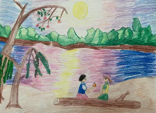На рисунке я изобразила пляж вдоль Живописной улицы. Это недалеко от моего дома. Мы с подружкой любим гулять вдоль берега Москвы-реки. Это стало нашей доброй традицией. Мы проводим так свои вечера. Здесь растут ивы и красочный закат.
