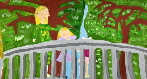 Аня изобразила маму и сестру на мостике в парке «Кузьминки». Работа выполнена в тех. гуашь. Очень интересное фрагментальное решение композиции. Это и семейный портрет, и достопримечательность парка «Кузьминки» горбатый мостик.