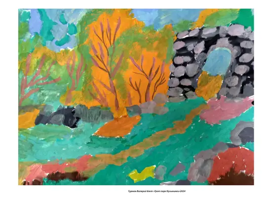 Каменный грот в парке Кузьминки.Сооружение датируется 1830г. Валера изобразил прекрасный осенний пейзаж с элементами архитектуры. небольшой фрагмент исторического памятника. прекрасно вписывается в теплую, контрастную цветовую гамму юного художника. Формат а2 тех.гуашь