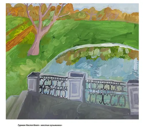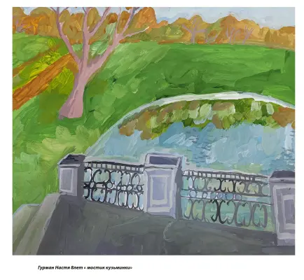 Небольшой мостик на прудах в парке «Кузьминки». Любимое место отдыхающих и молодожен. Приятная цветовая гамма. Осенний мотив. Нежная лирика. Переносит нас во времена Пушкина. Формат а2 гуашь.