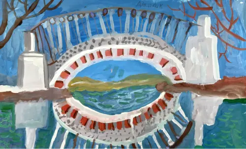 Каменный горбатый мостик в усадьбе Кузьминки. Памятник архитектурного зодчества. Даша нарисовала работу на формате А2 гуашью. Ясный день и прекрасная прогулка в парке!