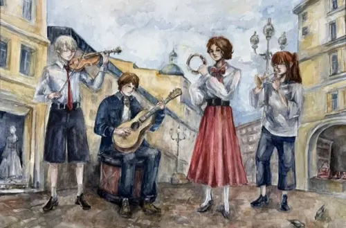 Работа выполнена на бумаге, формат А2, техника — акварель. На работе изображены уличные музыканты, старая московская улица АрбатРабота выполнена на бумаге, формат А2, техника — акварель. На работе изображены уличные музыканты, действие происходит на старой московской улице — Арбат.