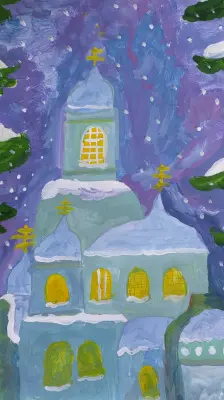 Лера изобразила на работе зимний вечер. Белые снежинки мягко ложатся на большие сугробы. Уже темнеет, а из окон храма льется теплый свет. Идет рождественская служба. Храм в усадьбе Кузьминки.