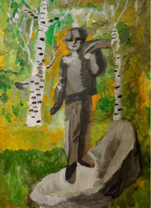 Достопримечательность ЮВАО – парковая скульптура. Мой район. Есенинский бульвар, памятник поэту С. Есенину. Формат работы А2. Техника – гуашь. Скульптор – В.Е. Цигаль. 1972 г.