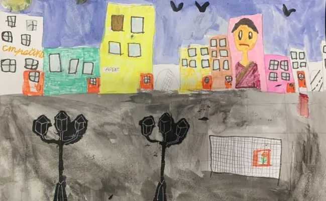 Я нарисовала свой любимый район — Арбат. На одном из окон — цветок, такой же яркий, как и вся улица. В небе летают птицы, их здесь всегда много! Рядом идёт стройка, ведь Арбат — это место, где всегда что-то происходит, где жизнь бьет ключом, и где новые дома растут, как цветы!