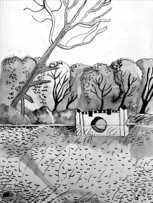 Монохромная работа. Мостик у пруда в парке Кузьминки. Тональный разбор пейзажа. Сочетание разных фактур: листьев, воды, коры. Материал бумага, тушь, кисть, перо. Формат работы А3.