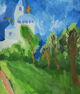 Живописный этюд, выполненный в технике гуашь. Летняя практика, пленэр. Задание на состояния природы. Солнечное освещение. Игра света и тени. Материал: бумага, гуашь. Формат А3.