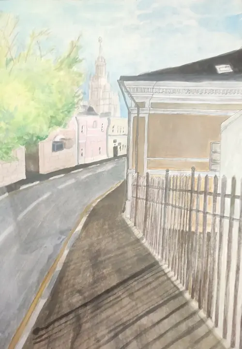 Московские улочки наполнены историей и уютом, в них много солнца, цветов и красивой архитектуры. Работа выполнена на листе А3 акварелью.
