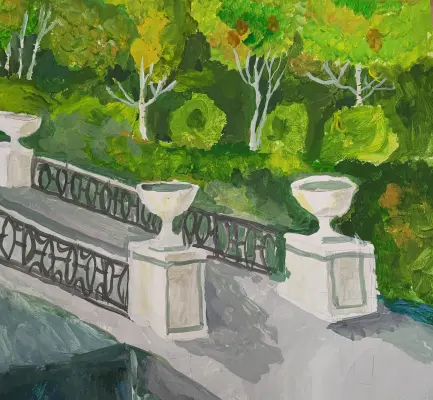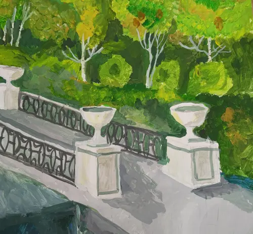 Любимое место прогулок с родителями. Парковая зона усадьбы Кузьминки. Работа выполнена в технике: бумага, гуашь. Сдержанная цветовая гамма подчеркивает спокойный пейзаж с мостиком. Формат А3.