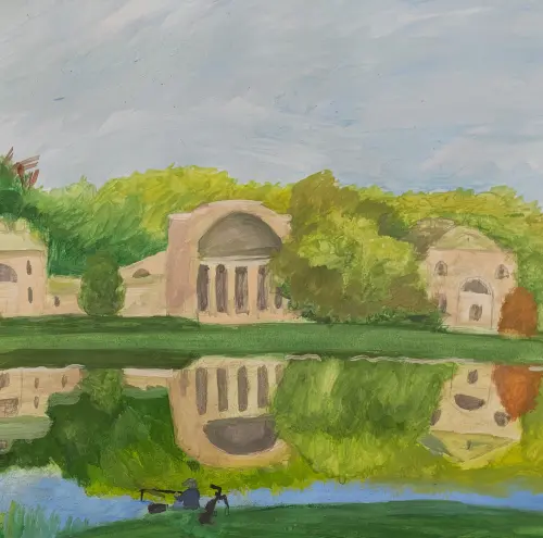 Перед нами прекрасная усадьба Кузьминки ранним утром. Тихий размеренный пейзаж. На заднем плане виден архитектурный комплекс" Конный двор", а на переднем плане пристроился рыбак и спокойно ловит рыбу, наслаждаясь видом усадьбы. Это деталь придает необыкновенную камерность и уют этой работе. формат А2. тех.гуашь.