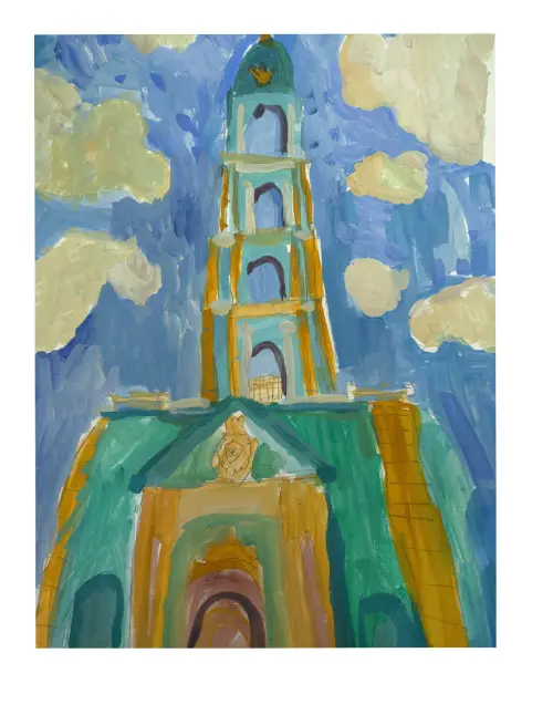 На работе изображен памятник архитектурного зодчества. Часть храма Живоначальной Троицы на Рязанском проспекте. Этот памятник архитектуры создан в 1774 году. Композиция работы подчеркивает его устремленность в высь. Формат А2, тех. гуашь.