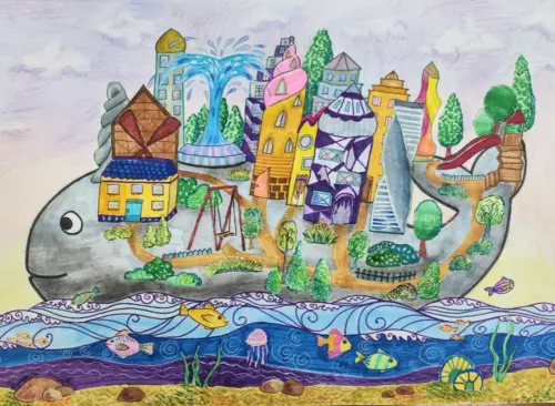 На данной картинки изображён город-сказка, город-сон. Но мне почему-то всегда думается, глядя на свою работу, что это Москва, небольшой её уголок, мой район. Не знаю, почему такие ощущения, но это так. Мб потому что все мы родом из детства, и в детстве всегда ощущаешь себя в некой другой, не взрослой реальности. Так, что даже фантастический город может показаться родным двором
