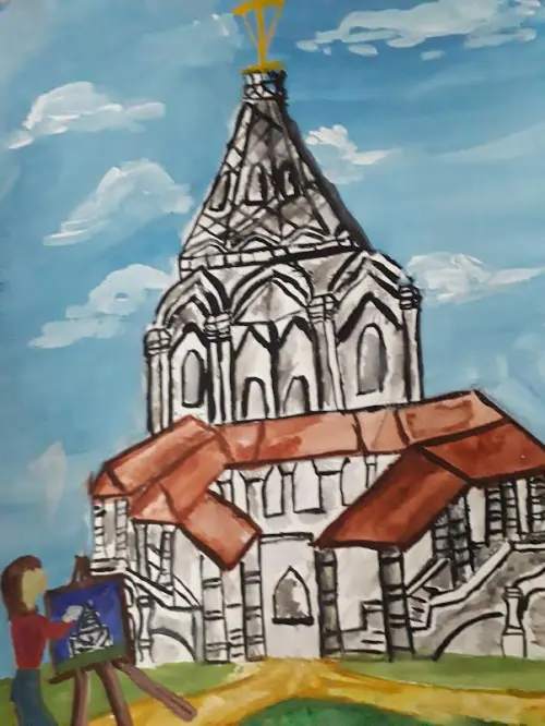 Поехал с родителями погулять в Коломенское. Очень понравился храм и захотелось его изобразить Мы живем в районе Котловка это прекрасный район.В выходные дни мы выезжаем в музеи, знакомимся с архитектурными памятниками. В Москве их очень много Мне с родителями очень нравится гулять в Коломенском. Очень понравился храм, который восхитил своим величием и захотелось его изобразить