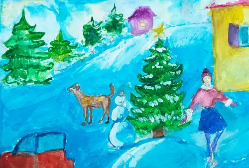 Зимой мы любим гулять с собакой, она очень любит снег. Резвится, бегает. Особенно перед новогодними праздниками на улице становится очень красиво. Наряжают ёлку во дворе и настроение становится праздничным.