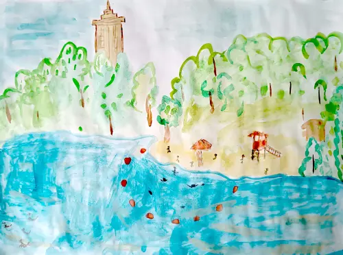 На рисунке изображен большой садовый пруд на ул большая академическая в летний период, когда на пляже много отдыхающих людей, часть из которых отдыхает на суше, часть купается, вдалеке виден Тимирязевский лесопарк, высотка на Динамо. На пруду плавают утки. Очень любим отдыхать здесь в летнее времяНа рисунке изображен большой садовый пруд на ул большая академическая в летний период, когда на пляже много отдыхающих людей, часть из которых отдыхает на суше, часть купается, вдалеке виден Тимирязевский лесопарк, высотка на Динамо. На пруду плавают утки. Очень любим отдыхать здесь в летнее время