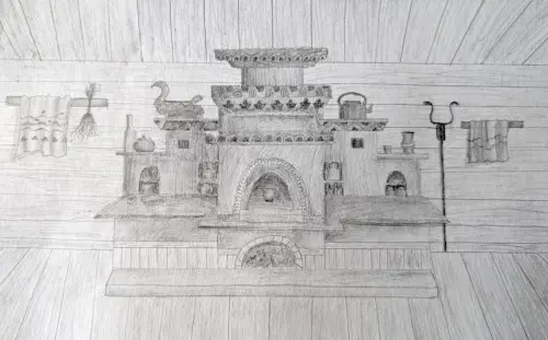 В районе, где мы живем, раньше располагались деревни. Сейчас здесь всё выглядит современно и по-новому, но мне захотелось представить, как всё выглядело много лет назад, какой быт вели люди, которые жили на этом месте, поэтому я изобразила свой район в старом обличии.