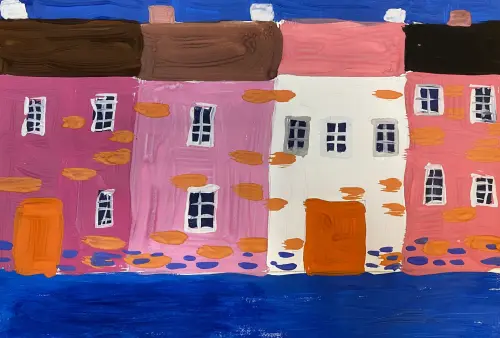 Я изообразила трехэтажное здание, входящее в этот комплекс (Комсомольский проспект, дом 13), – Шефский дом. Оно было построено в конце XVIII века по проекту Матвея Казакова в стиле раннего московского классицизма. «Этот дом был построен на территории суконной фабрики, основанной еще Петром Великим, на так называемом окоеме Хамовнического плаца.