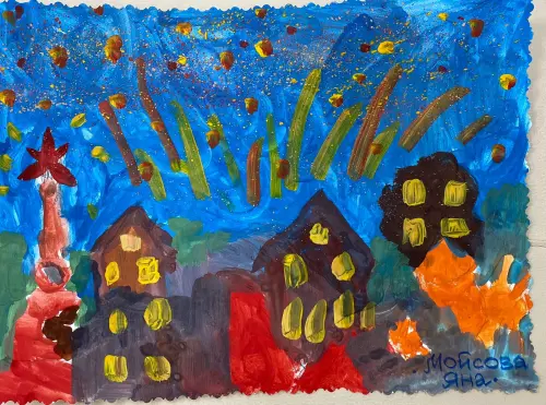 Праздники в моем районе всегда яркие и душевные. И даже когда смотришь из окна. Работу делала под руководством Антоновой Елены Анатольевны в арт студии Детского центра Звезда