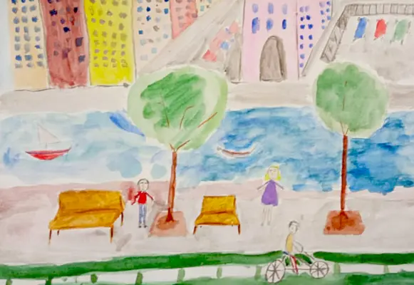 Это мой самый любимый парк. Мы с семьей любим устраивать там пикники. Мы сидим около реки, там плавают разные лодки и корабли. Я с сестрой люблю наблюдать за ними. А еще там есть велодорожки и катаются велосипедисты.