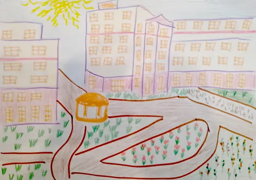 Со слов ребенка: " Это мой двор, в котором я люблю гулять со своими друзьями. Во дворе есть большая беседка, где мы любим сидеть и вокруг много дорожек, по которым я люблю кататься на велосипеде. Везде много цветов и кустов. Они очень красивые. Весь двор окружен нашими домами. Очень много окон. Когда наступает вечер, все окна зажигаются и очень много света сразу. Нам не страшно гулять. Я очень люблю свой дом и двор. У меня, конечно, не очень хорошо получилось все нарисовать, но я старался. На сомом деле все красивее."